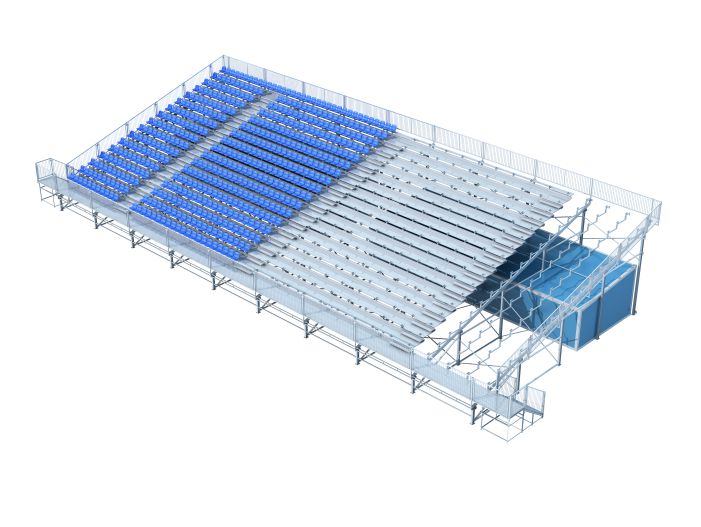 產品特點:主要結構(斜梁、立柱)采用承載能力強勁的H型鋼,可滿足高排數、挑高、大開間設計需求,其底部空間可多元化利用,增設儲物間、休息室、多功能房等,是室外大型看臺系統首選。